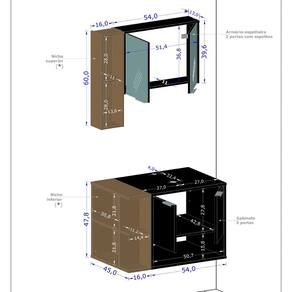 Material da espelheira: MDP de 12 mm e 15 mm com espelho de 03 mm de espessura;