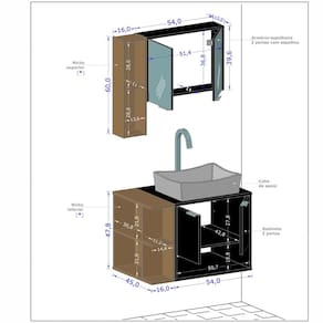 Material da espelheira: MDP de 12 mm no painel e 15 mm na prateleira com espelho de 03 mm de espessura;