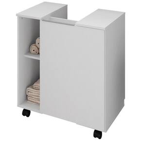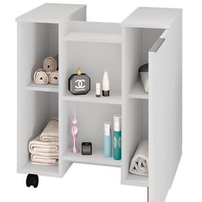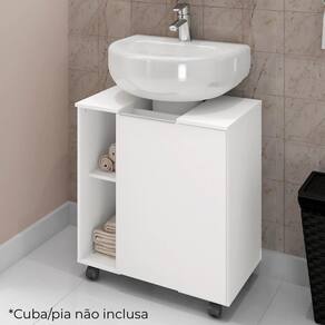 Gabinete para Banheiro Pequin, ideal para otimizar o espaço com praticidade no dia a dia. Estrutura em MDP (12mm) com acabamento em pintura UV texturizada. Possui porta, dobradiças metálicas, puxador (alumínio), nichos internos/ externos e rodízios em plástico. Ideal para encaixe em pias de coluna. Este produto será entregue em 1 volume.