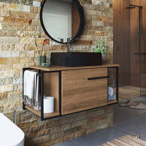 O Gabinete para Banheiro P1019 da Placa & Ponto combina design industrial e funcionalidade para deixar o banheiro mais sofisticado. Sua estrutura em metal garante durabilidade, enquanto as prateleiras e tampo em MDP proporcionam um acabamento elegante. Com uma porta basculante, dois nichos e um porta-toalha integrado, este móvel otimiza o espaço e oferece praticidade. Acompanha a Cuba Berlin Preta, agregando ainda mais estilo ao ambiente.