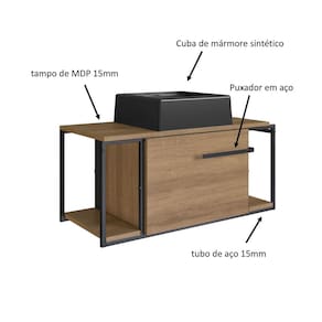 CARACTERÍSTICAS TÉCNICAS: - Estrutura metálica resistente - Cor: Preto e Marrom - Prateleiras, tampo e porta em MDP de 15mm - 1 porta basculante - 2 nichos organizadores - 1 porta-toalha integrado - Acompanha Cuba Berlin Preta - Suporta até 15kg