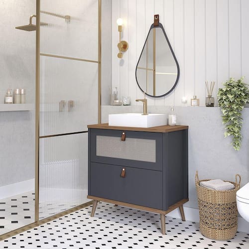 Características: Estrutura em MDF Acabamento em Pintura UV Puxador e alça em couro 01 Porta com pistão à gás e dobradiças metálicas 01 Gaveta com corrediças telescópicas Acompanha cuba em mármore sintético Acompanha espelho