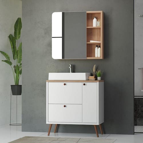 O Gabinete com Pés Madri com Cuba é desenvolvido em MDP/MDF com acabamento em BP e Cuba em mármore sintético.