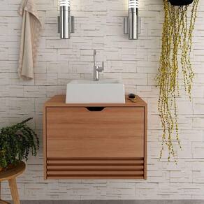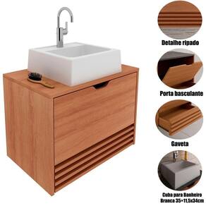 Características do Armário de Banheiro 60 cm com Cuba: - Estrutura em MDP; - Acabamento em BP e parte pintura UV; - 1 porta basculante; - 1 gaveta com corrediças metálicas; - Detalhe em ripado; - Suporta até 10 kg tampo e 3 kg gaveta e interno; - Cuba em mármore sintético e acabamento em brilho polido; - Não acompanha torneira; - Não acompanha objetos de decoração;