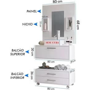- Balcão inferior: 30cm altura / 80cm comprimento / 39cm profundidade