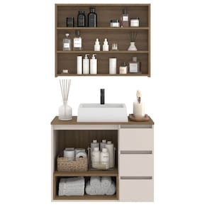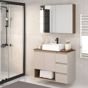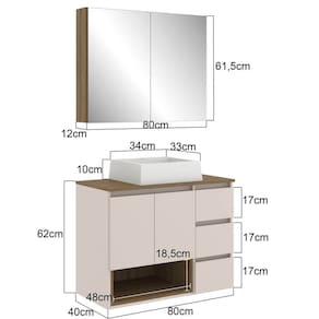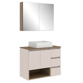O conjunto de balcão gabinete e espelheira CJ9280 é perfeito para compôr um ambiente bonito e funcional. Possui design moderno e sofisticado e vai deixar sua casa elegante e confortável! A espelheira deste conjunto possui 2 portas com espelho e 2 prateleiras internas práticas para armazenar produtos de higiene pessoal, medicamentos e acessórios de banheiro e o gabinete possui 2 portas com bastante espaço interno, 3 gavetas e 1 nicho, que são ideais para armazenar produtos de higiene, toalhas e outros itens essenciais. Acompanha cuba de sobrepôr branca. Acabamento da Cuba: Acetinado Acabamento da Gaveta: Finish Foil Acabamento da Porta: Finish Foil Acabamento da Prateleira: Finish Foil Acompanha Cuba: Sim Acompanha Gaveteiro: Não Acompanha Manual de Instalação: Sim Acompanha Parafusos Para Fixação Na Parede: Sim Acompanha Tampo: Sim Acompanha Válvula: Não Altura do Espelho: 61 cm Ambiente Principal: Banheiro codigo_ean: 7900288138354 Complexidade da Montagem: Média: pode ser montado por mais de uma pessoa e/ou necessite de maior conhecimento para montagem Comprimento da Prateleira: 76,9 cm Cor: Mel/Arenas Cor da Cuba: Branca Cor da Gaveta: Bege Cor da Porta: Bege Cor do Produto: Mel/Arenas Cor Flex: Não Cor Interna: Mel/Arenas Escala de Brilho: Fosco Escala de Brilho da Gaveta: Fosco Escala de Brilho da Porta: Fosco Escala de Brilho da Prateleira: Fosco Espessura do Espelho: 3 mm Formato da Cuba: Retangular Formato do Espelho: Retangular Formato Espelheira: Retangular Furação para Cuba e Torneira: Não Gaveta com Chave: Não Itens Inclusos: 1 Conjunto Gabinete com Espelheira, Cuba, Kit Ferragens e Manual de Montagem Largura do Espelho: 39 cm Linha ou Coleção: Banheiro Manual de Montagem e Instalação: https://cdn2.madeiramadeira.com.br/atributo/faema/2898008-5225-17462068086996.pdf Marca: FAEMA Material da Cuba: Mármore Sintético Material da Gaveta: MDP Material da Porta: MDP Material da Prateleira: MDP Material do Tampo: MDP Material Principal: MDP Medida da Cuba (C x L x P): 34x33x33 Medida da Espelheira (A x L x P): 61,5x80x12 Medida do Gabinete (A x L x P): 62x80x40 Montagem Flex: Não Necessita Montagem: Sim Origem do Produto: Nacional Peso: 44,5 kg Peso Máximo por Gaveta: 5 kg Peso Máximo por Prateleira: 5 kg Possui Espelheira: Sim Possui Gabinete: Sim Possui Gavetas: 03 Possui iluminação: Não Possui Nichos: Sim Possui Pés: Suspenso Possui Porta de Vidro: Não Possui Portas: 04 Possui Recorte No Tampo Para Cuba: Não Possui Recorte No Tampo Para Misturador: Não Possui Rodízio: Não Possui Sifão: Não Possui Tampo: Sim Possui Tampo de Vidro: Não Produto Montado: Não Quantidade de Espelhos: 02 Espelhos com Tamanhos Iguais Recomendações de Uso, Manutenção e Limpeza: Para a limpeza do móvel utilizar pano levemente umedecido com água Sistema de Montagem: Parafusos,cavilhas e minifix Suporta Até (kg): 55 kg Suporte para Toalheiro: Não Tamanho do Espelho (A x L): 61 x 39 Tamanho do Gabinete: Médio: de 60cm a 80cm de largura Tamanho do Produto: 123,5x80x40 Tipo de Corrediça da Gaveta: Metálica Simples Tipo de Cuba: Sobrepor Tipo de Dobradiça/Corrediça da Porta: Metálica Tipo de Fixação do Espelho: Silicone Tipo de Gabinete: Gabinete Suspenso Tipo de Gaveta: Externa Tipo de Porta: Bater Tipo de Puxador da Gaveta: Não Contém Tipo de Puxador da Porta: Não Contém