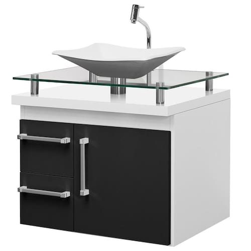 Gabinete - Medida: 555 x 420 x 460mm - Puxadores em aluminio com ponteira em ABS - Cuba em mármore sintético na cor branca - Tampo em MDF com vidro temperado com furos para torneiras e vávula - Corrediças telescópica (250mm) - MDF 15mm pintura UV - Bordas em PVC - Gavetas revestidas em PET, que garantem um perfeito acabamento - Dobradiça com pistão com ângulo de abertura de 110º