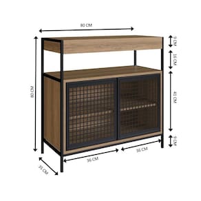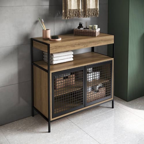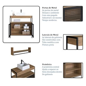 Armário de banheiro estilo industrial. Com duas portas vazadas para aumentar a circulação de ar dentro do mesmo, este produto contém uma prateleira central no interior ideal para guardar seus itens de higiene. Aceita cubas de sobrepor com medidas de até 33x33.