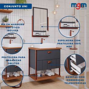 que tal o conjunto de banheiro uni? transforme seu banheiro com o conjunto uni, que inclui gabinete e espelheira, peças perfeitas para otimizar e embelezar o ambiente. com estrutura em mdf e metalon, elas têm ótima resistência para o uso diário, enquanto também oferecem bom espaço de armazenamento, graças às 2 gavetas presentes no gabinete. completo para o dia a dia, o kit acompanha cuba de mármore sintético, que traz um toque de sofisticação ao ambiente e ainda facilita o processo de limpeza no dia a dia. destacando as cores atemporais e os puxadores concha, as peças deixarão seu banheiro mais bonito e elegante, como você sempre sonhou. Marca: Modern