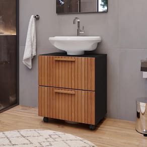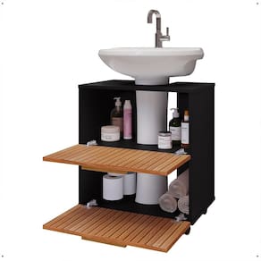 Gabinete de Banheiro Prime Armário Para Pia De Coluna Preto Ripado O Armário de Banheiro Coluna Prime combina funcionalidade e estilo. Suas portas basculantes garantem fácil acesso aos seus itens, enquanto as rodinhas facilitam a movimentação para limpeza. Os puxadores em madeira adicionam um toque de elegância ao seu ambiente. Organize seu banheiro com praticidade e sofisticação.
