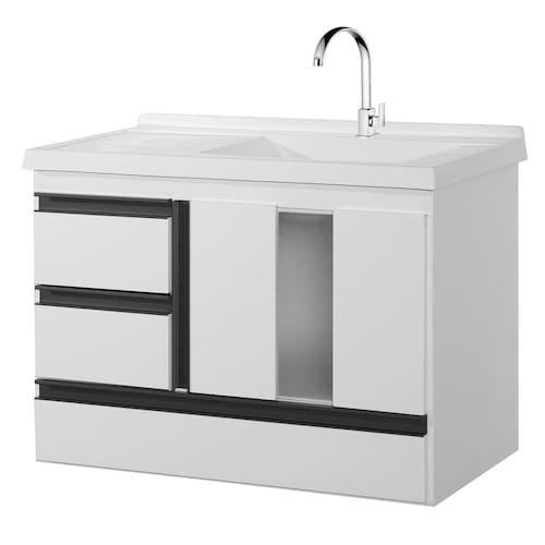 Gabinete - Medida: 765 x 405 x 545mm - Puxadores com perfil em aluminio - Pia em mármore sintético na cor branco (800 x 440mm) - Corrediças telescópica (350mm) - MDF 15mm pintura UV - Bordas em PVC - Gavetas revestidas em PET, que garantem um perfeito acabamento - Dobradiça com pistão com ângulo de abertura de 110º.