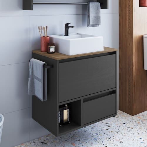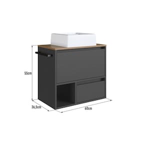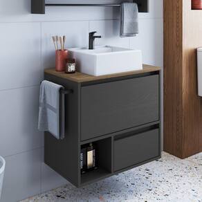 Gabinete de Banheiro Suspenso 60cm com 1 Nicho 1 Toalheiro 1 Porta e 1 Gaveta com Cuba Mel/Grafite - Preto