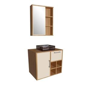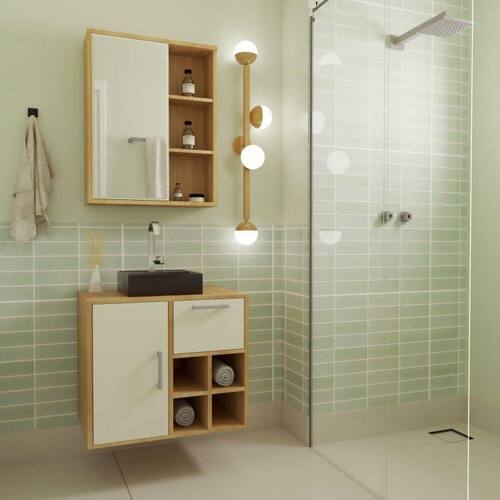 O gabinete de banheiro e espelheira CJ7242 possui balcão com 1 gaveta, 1 porta, 1 prateleira interna e 4 nichos que ficaram lindos no móvel!!!! A espelheira possui uma porta de bater com espelho e 2 prateleiras internas que são ideais para você dispôr seus produtos de beleza e higiene. Contém também duas prateleiras externas para você decorar ou organizar seus produtos que mais precisam ficar à mão. Produzido em MDP 15mm. Acompanha cuba preta. Altura do Conjunto: 124 cm Ambiente: null Ambiente Principal: Banheiro Cor: Mel/Arenas Informação Complementar: 1x Armário de Banheiro com Espelho 1 Porta 2 Preteleiras Eduarda Mel/Arenas Largura: 60 Altura: 65 Peso: 10.4 Profundidade: 14 Necessita Montagem: Sim