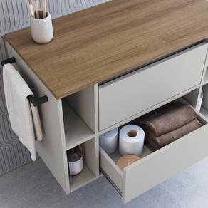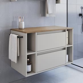 Tipo: Gabinete de banheiro suspenso com porta, gaveta, nichos e toalheiro