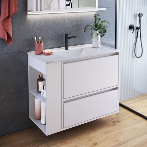 O gabinete para banheiro BL2002 da Faema possui design inovador e funcional, tornando seu banheiro ainda mais lindo! Ele possui nicho lateral que irá acomodar perfeitamente utensílios essenciais para o seu banheiro e ainda você pode escolher de que lado do gabinete você quer usá-lo! Produto acompanha lavatório em mármore sintético, uma porta basculante e uma gaveta. Acabamento da Cuba: Liso Acabamento da Gaveta: Finish Foil Acabamento da Porta: Finish Foil Acabamento da Prateleira: Finish Foil Acompanha Cuba: Sim Acompanha Manual de Instalação: Sim Acompanha Parafusos Para Fixação Na Parede: Sim Ambiente Principal: Banheiro codigo_ean: 7909903893814 Complexidade da Montagem: Baixa: pode ser montado por uma pessoa sozinha Comprimento da Prateleira: 35 cm Cor: Branco Cor da Cuba: Branco Cor do Produto: Branco Cor Flex: Não Cor Interna: BRANCO Escala de Brilho: Fosco Escala de Brilho da Gaveta: Fosco Escala de Brilho da Porta: Fosco Escala de Brilho da Prateleira: Fosco Espessura da Prateleira: 1,5 cm Furação para Cuba e Torneira: Não Gaveta com Chave: Não Itens Inclusos: 1 gabinete com lavatório e manual de montagem Linha ou Coleção: Banheiro Manual de Montagem e Instalação: https://product-hub-prd.madeiramadeira.com.br/936145/documents/b80d9693-5b83-467f-86f1-9bbe0f8fe02e2268049522517248044585866.pdf Material da Cuba: Mármore Sintético Material da Gaveta: MDP Material da Porta: MDP Material da Prateleira: MDP Material Principal: MDP Medida da Cuba (C x L x P): 14x80x37 Montagem Flex: Sim, nicho lado direito ou esquerdo. Necessita Montagem: Sim Origem do Produto: Nacional Peso: 25,3 kg Peso Máximo por Gaveta: 5 kg Peso Máximo por Prateleira: 2 kg Possui Nichos: 02 Possui Pés: Suspenso Possui Recorte No Tampo Para Cuba: Não Possui Recorte No Tampo Para Misturador: Não Possui Sifão: Não Possui Tampo: Não Produto Montado: Não Quantidade de Gavetas: 01 Recomendações de Uso, Manutenção e Limpeza: Para a limpeza do móvel utilizar pano levemente umedecido com água Resistente à Chuva: Não Sapatas Niveladoras: Não Sistema de Montagem: Parafusos, cavilhas e minifix Suporta Até (kg): 25 kg Tipo de Corrediça da Gaveta: Metálica Simples Tipo de Dobradiça/Corrediça da Porta: Metálica Tipo de Móvel para o Banheiro: Gabinete de Banheiro Tipo de Porta: Basculante Tipo de Puxador da Gaveta: Embutido Tipo de Puxador da Porta: Embutido Válvula indicada: Válvula padrão