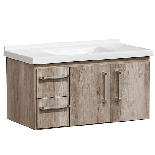 Gabinete - Medida: 750 x 405 x 400mm - Puxadores em aluminio com ponteiras em ABS - Pia em mármore sintético branco 800 x 440 mm - Corrediças telescópica (250mm) - MDF 15mm pintura UV - Bordas em PVC - Gavetas revestidas em PET, que garantem um perfeito acabamento - Dobradiça com pistão com ângulo de abertura de 110º