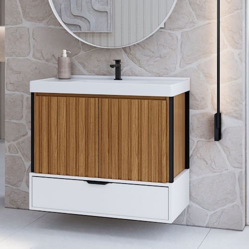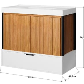 A modernidade desse gabinete é atrelada aos contrastes das cores da madeira, de seu design ripado e das cores sólidas. Ele é uma peça imponente, cheia de detalhes, que une a o que há de melhor na decoração para agregar ao seu banheiro. O tampo em mármore sintético é ideal para quem busca praticidade no dia a dia. Acabamento da Cuba: Alto Brilho Acabamento da Gaveta: Pintura UV Acabamento da Porta: Pintura UV Acabamento da Prateleira: Pintura UV Acompanha Cuba: Sim Acompanha Manual de Instalação: Sim Acompanha Parafusos Para Fixação Na Parede: Não Ambiente Principal: Banheiro codigo_ean: 7909903812389 Comprimento da Prateleira: 70 cm Cor: Branco Cor da Cuba: Branco Cor do Produto: Branco Cor Interna: Freijó Escala de Brilho: Fosco Escala de Brilho da Gaveta: Fosco Escala de Brilho da Porta: Fosco Escala de Brilho da Prateleira: Fosco Espessura da Prateleira: 12 cm Furação para Cuba e Torneira: Sim Gaveta com Chave: Não Itens Inclusos: 01 Gabinete Aéreo, Manual de Montagem e Kit Ferragens Linha ou Coleção: Ana Manual de Montagem e Instalação: https://product-hub-prd.madeiramadeira.com.br/921269/documents/f6c9a880-6bf4-41fc-8561-3c369fb4f2e42110842371917199439690657.pdf Material da Cuba: Mármore Sintético Material da Gaveta: MDF Material da Porta: MDF Material da Prateleira: MDF Material do Puxador da Gaveta: ABS Material do Tampo: Mármore Sintético Material Principal: MDF Medida da Cuba (C x L x P): 8x80x40,5 Medida do Recorte Para Misturador: 4 Necessita Montagem: Não Origem do Produto: Nacional Peso: 29 kg Peso Máximo por Gaveta: 12 kg Peso Máximo por Prateleira: 12 kg Possui Nichos: Não Possui Pés: Não Possui Portas: Sim Possui Prateleiras: Sim Possui Recorte No Tampo Para Cuba: Não Possui Recorte No Tampo Para Misturador: Sim Possui Sifão: Não Possui Tampo: Sim Produto Montado: Não Quantidade de Gavetas: 01 Recomendações de Uso, Manutenção e Limpeza: Utilize flanela seca ou pano macio, levemente umedecido com água. Evite contato com produtos químicos e abrasivos (solventes, thinner, acetona etc) e não utilize nenhum tipo de esponja de aço. Resistente à Chuva: Não Suporta Até (kg): 35 kg Tipo de Corrediça da Gaveta: Metálica Telescópica Tipo de Dobradiça/Corrediça da Porta: Metálica Tipo de Móvel para o Banheiro: Gabinete de Banheiro Tipo de Porta: Bater Tipo de Puxador da Gaveta: Externo Tipo de Puxador da Porta: Embutido Tipo do produto: gabinete Válvula indicada: 4