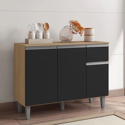 Características: Material da Estrutura: MDP Acabamento: Pintura UV Escala de Brilho: Fosco Possui 3 portas Possui 1 gaveta Dobradiças em aço Puxadores embutidos Pés em PVC com regulagem Corrediças metálicas Design moderno Acompanha Tampo: Sim