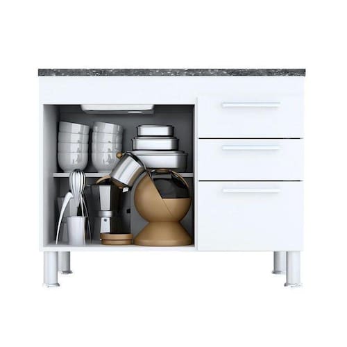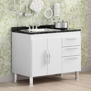 Gabinete de pia gemeos 1,00m gabinete para pia este gabinete é produzido especialmente para pias de 1,00m, possui 3 gavetas com corrediças metálicas para melhor armazenar os itens de cozinha e conta com uma prateleira profunda completa no seu interior. Possui puxadores modernos e 4 pés para evitar empenamento da base, o gabinete é totalmente fabricado em mdp de 12mm, aumentando a durabilidade, resistência e qualidade do produto. O gabinete não acompanha o tampo da imagem. Além desses detalhes possui uma facil montagem.Altura total 0,83m x largura 0,935m x profundidade 0,52m x peso 22kgnão nos responsabilizamos pela montagem ou instalação do produto. Sugerimos a contratação de um serviço terceirizado de montagem ou de algum profissional experiente de sua preferencia. Imagem meramente ilustrativa