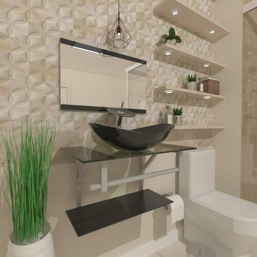 Gabinete de vidro 40cm ac com cuba oval preto os nossos gabinetes são indicados para projetos arrojados e de muito bom gosto, além de valorizar o seu ambiente com sofisticação em uma decoração de alto padrão, ele consegue usufruir das vantagens que o vidro proporciona e gerar uma durabilidade indiscutível, sem contar que com as várias opções de cores, você sempre poderá encontrar uma cor perfeita para o seu banheiro. Os vidros são pintados com tinta de alta performance o que lhe garante a permanência da cor. Itens inclusos: - bancada de vidro com furo para torneira 3,5cm diâmetro e válvula click 4,5cm diâmetro ; - cuba de vidro oval; - espelho; - estrutura e porta toalha de aço carbono com pintura eletrostática cinza; - kit parafusos completo para instalação; - prateleira de vidro da bancada; - válvula click. Dimensões: - bancada de vidro: 40 x 40cm largura x profundidade - cuba de vidro oval: 38 x 26cm comprimento x profundidade - prateleira bancada: 40 x 20cm largura x profundidade - espelheira: 40 x 40cm largura x altura - porta toalha: 40cm largura - válvula: 1 1/4