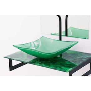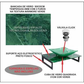 Gabinete De Vidro 50cm Com Cuba Quadrada - Mármore Verde Os nossos gabinetes são indicados para projetos arrojados e de muito bom gosto, além de valorizar o seu ambiente comSofisticação em uma decoração de alto padrão, ele consegue usufruir das vantagens que o vidro proporciona e gerar uma durabilidadeIndiscutível, sem contar que com as várias opções de cores, você sempre poderá encontrar uma cor perfeita para o seu banheiro. Dados técnicosItens inclusos: gabinete de vidro 50cm para banheiro é composto de bancada de vidro texturizada, cuba de vidro quadrada, válvula, Estrutura em aço eletrostático preto e kit parafusos completo para instalação. Dimensões: - bancada de vidro: 50cm x 35cm largura x profundidade - cuba de vidro quadrada: 31cm - válvula: 1 1/4 Espessuras: - bancada de vidro temperado: 8mm - cuba de vidro: 10mm Garantia: 12 meses conforme política de troca e devoluções . Atenção: preço referente somente ao gabinete, não acompanha torneira, sifão, espelho, prateleira e acessórios. Montagem: montagem e instalação não inclusa na venda ou preço do produto, elas são de inteira responsabilidade do cliente. Imagens ilustrativas.