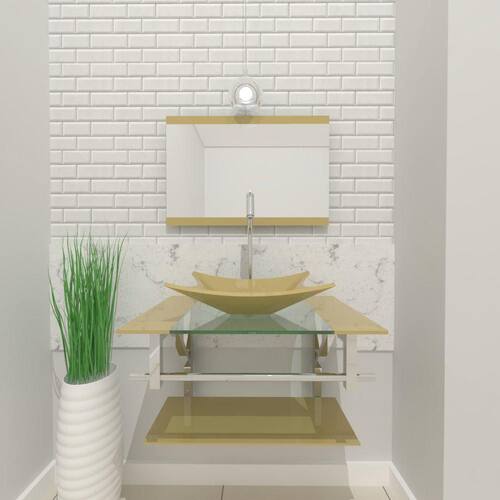 Espessuras: - bancada de vidro: 8 mm - cuba de vidro: 10 mm - prateleira bancada: 6 mm - espelheira: 3 mm