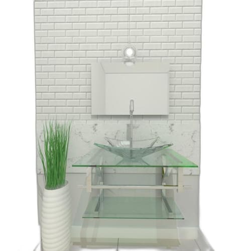 Espessuras: - bancada de vidro: 8 mm - cuba de vidro: 10 mm - prateleira bancada: 6 mm - espelheira: 3 mm