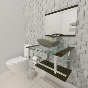 Itens Inclusos: Gabinete de Vidro 60cm para banheiro composto de bancada de vidro, cuba de vidro, prateleira da bancada, espelheira, válvula clic, estrutura e porta toalha de Inox e kit parafusos completo para instalação.