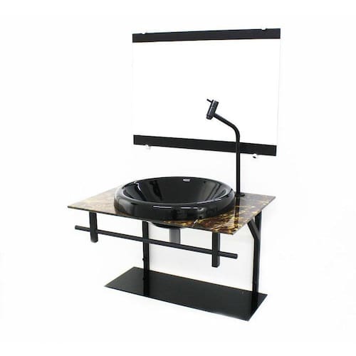 Itens inclusos: - bancada de vidro com furo para torneira (3,5cm diâmetro); - cuba de vidro chapéu; - espelho; - estrutura e porta toalha de aço eletrostático; - kit parafusos completo para instalação; - prateleira de vidro da bancada; - válvula click.