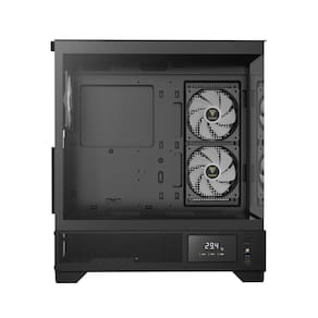 A conectividade do painel frontal é robusta, apresentando uma porta USB 3.0, uma porta USB-C e uma entrada de áudio HD, além de botões de power, led e monitor para um controle fácil e rápido do sistema. O suporte para fans é amplo, acomodando até três fans de 120mm ou dois de 140mm na parte superior, duas fans de 120mm na lateral duas já pré-instaladas , e uma fan de 120mm na parte traseira pré-instalada .