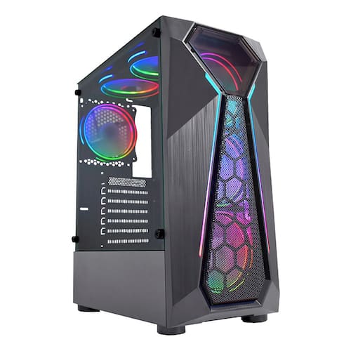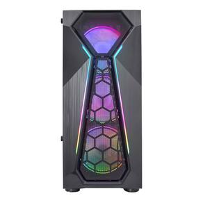 O Gabinete Gamer K-Mex Warlock CG-A1D4 possui um design distinto, com painel frontal preto com grade de ventilação e detalhe em barra LED RGB Rainbow, com iluminação personalizável.