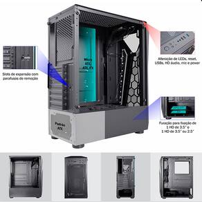 Ainda conta com uma entrada USB 3.0 e duas entradas USB 2.0, além de Áudio HD. É compatível com placa mãe Micro ATX, ATX, ITX.