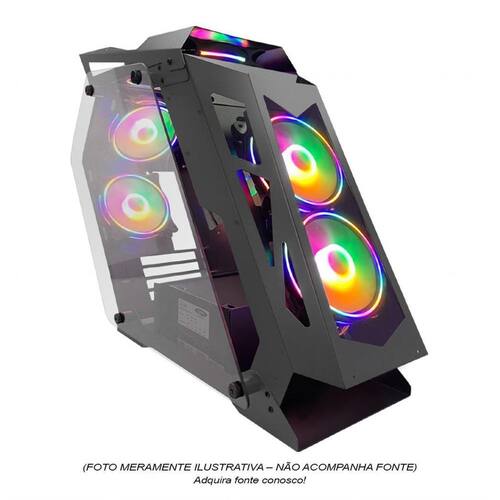 Principais características: Design inovador estilo CaseMod Cor: Preto Acompanha 6 fans coolers de 120mm RGB Compatibilidade com placas mãe ATX, Micro ATX e Mini ATX. Suporte para fonte ATX 12v Quantidade de Coolers Suportados: 6 de 120mm Espaço para 2 disco 3.5 HDD e 2 discos 2.5 SSD. Painel frontal com 1 porta USB 3.0, 2 portas USB 2.0 e saídas de áudio. Lateral com vidro temperado, proporcionando uma visão elegante do interior. Tamanho máximo suportado para placa de vídeo PCI-E: 310mm. Compatibilidade com fans: 3x 120mm na parte frontal e 1x 120mm na parte traseira. Dimensões: 58x50x23 Peso bruto: 7kg