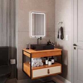 O Gabinete Harley combina a madeira com puxador em material sintético e um espelho retangular iluminado por LED.