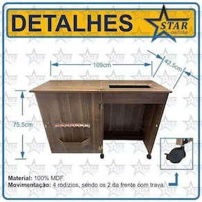 O gabinete é compatível apenas com a máquina de costura Singer Promise 1408, garantindo um encaixe perfeito e seguro. Para facilitar a montagem, o produto é enviado desmontado e acompanha um manual passo a passo detalhado. Além disso, o kit também inclui rodinhas com trava, porta cone de linha exclusivo da Star Costura, tesourinha de arremate plástica com dedal, fita métrica colorida e um mini catálogo com cupom de desconto para a próxima compra.