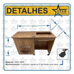 Com medidas montadas de 43,5cm de largura, 75cm de altura e 54,5cm de comprimento quando fechado 108,5cm quando aberto , o gabinete oferece um espaço amplo para você trabalhar com conforto. A abertura da máquina possui as medidas de 42,5x18cm, e o encaixe entre um pino e o outro é de 24,5cm. O espaço interno para as pernas é de 49,5cm de largura.