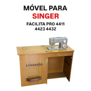 Gabinete para máquina de costura Singer, material MDF, compatível com diversos modelos Facilita Pro. Inclui medidas detalhadas do móvel fechado e aberto.Funções