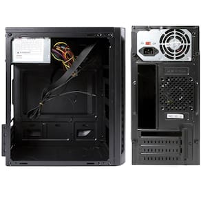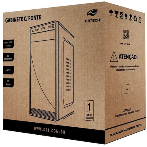 Características Gabinete Gabinete Torre Micro ATX Fonte 200Watts Inclusa Tamanho 2 Baias Suporta placas mãe Micro ATX Suporte a SSD 2,5 2 portas USB 1.1 frontais Entrada para microfone e saída para fone de ouvido (Padrão P2 3,5mm) HD Áudio