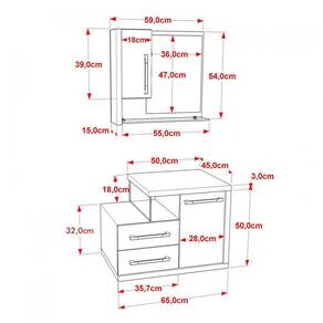 O Kit Legno 650 é um produto compacto, de design contemporâneo e minimalista, projetado para se encaixar no seu espaço, composto por um gabinete com cuba de apoio, detalhe em vidro 10mm e 2 gavetas laterais. A espelheira possui 1 porta, espelho lapidado e 1 prateleira de vidro 10mm, sendo perfeita para organizar suas coisas e fazer parte da decoração do seu banheiro. Acabamento da Cuba: Gel Acabamento da Gaveta: Pintura UV Acabamento da Porta: Pintura UV Acabamento da Prateleira: Vidro Acompanha Cuba: Sim Acompanha Tampo: Sim codigo_ean: 7893640088230 Complexidade da Montagem: Média: pode ser montado por mais de uma pessoa e/ou necessite de maior conhecimento para montagem Cor: Branco/Branco Chess Cor da Cuba: Branco Cor Interna: Branco Escala de Brilho: Brilhante Escala de Brilho da Gaveta: Brilhante Escala de Brilho da Porta: Brilhante Escala de Brilho da Prateleira: Brilhante Espessura do Espelho: 3 mm Formato do Espelho: Retangular Furação para Cuba e Torneira: Não Gaveta com Chave: Não Itens Inclusos: 1 Gabinete, 1 Cuba, 1 Espelheira e Manual de Montagem. Linha ou Coleção: Legno 650W Manual de Montagem e Instalação: https://product-hub-prd.madeiramadeira.com.br/508831/documents/7afffa59-9b16-4336-8e38-f34eb292499canuallegno650850sienamveis.pdf Material da Cuba: Mármore Sintético Material da Gaveta: MDF/MDP Material da Porta: MDF/MDP Material da Prateleira: Vidro Material do Tampo: MDF/MDP Material Principal: MDF/MDP Medida da Cuba (C x L x P): 35cm x 33,5cm x 10,5cm Medida do Gabinete (A x L x P): 50cm x 65cm x 45cm Necessita Montagem: Sim Origem do Produto: Nacional Peso: 34,1 kg Peso Máximo por Gaveta: 2 kg Peso Máximo por Prateleira: 1 kg Possui Espelheira: Sim Possui Gabinete: Sim Possui Gavetas: Sim Possui iluminação: Não Possui Pés: Suspenso Possui Portas: Sim Possui Rodízio: Não Produto Montado: Sim Recomendações de Uso, Manutenção e Limpeza: Para a limpeza, utilize flanela seca ou pano macio levemente umedecido em água. Utilize um pano seco em seguida. Evite contato com produtos químicos (solventes, thinner, acetona, etc.) e não utilize nenhum tipo de esponja de aço. Sistema de Montagem: Parafusos e Buchas. Tamanho do Espelho (A x L): 47cm x 36cm Tipo de Corrediça da Gaveta: Metálica Telescópica Tipo de Dobradiça/Corrediça da Porta: Metálica Tipo de Porta: Bater Tipo de Puxador da Gaveta: Externo Tipo de Puxador da Porta: Externo