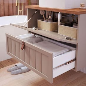 Beleza nos detalhes O gabinete possui 1 porta basculante e 1 gaveta em MDF com corrediças telescópicas super espaçosas. A cuba em mármore sintético combina charme e qualidade, devido a sua maior resistência a arranhões e manchas. O banheiro merece um gabinete que complete o ambiente!