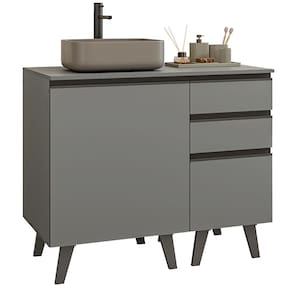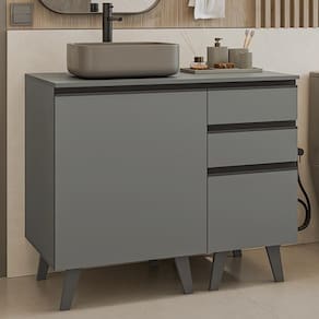 Com um design moderno, o balcão é composto por uma porta e três gavetas espaçosas, perfeitas para guardar produtos de higiene, toalhas e acessórios com praticidade.