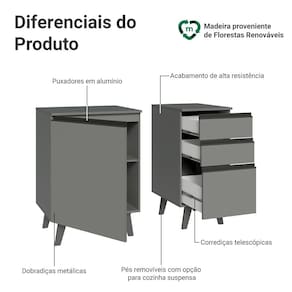 Produzido com materiais de qualidade, possui dobradiças metálicas nas portas e puxadores em perfil de alumínio, garantindo resistência. As gavetas possuem corrediças que permitem abertura total e o acabamento é de alta resistência, garantindo durabilidade.