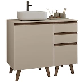 Com um design moderno, o balcão é composto por uma porta e três gavetas espaçosas, perfeitas para guardar produtos de higiene, toalhas e acessórios com praticidade.
