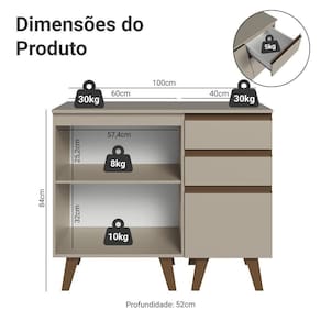 Produzido com materiais de qualidade, possui dobradiças metálicas nas portas e puxadores em perfil de alumínio, garantindo resistência. As gavetas possuem corrediças que permitem abertura total e o acabamento é de alta resistência, garantindo durabilidade.