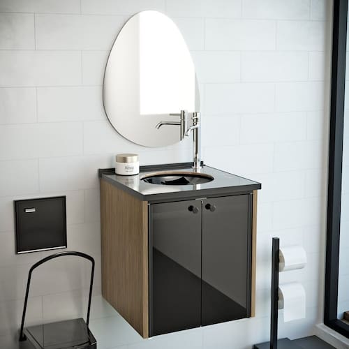 Gabinete com tampo em porcelanato polido, que reflete qualidade, sofisticação e inovação.