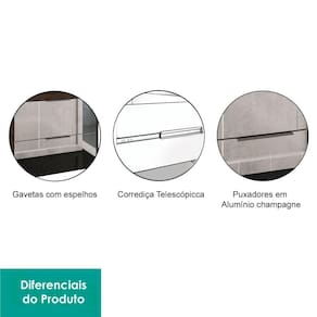 armário para banheiro suspenso com uma porta basculante espelhada com abertura com pistão à gás, uma gaveta espelhada e corrediça telescópica, puxadores em alumínio champagner, estrutura 100% MDF, amplo espaço interno, lavatório 100% mármore sintético com mais durabilidade e resistência.
