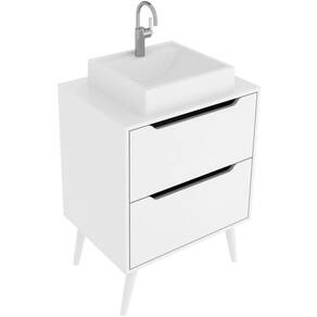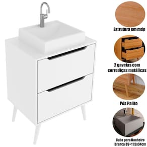 Características do Armário de Banheiro com Cuba: - Estrutura em mdp; - Acabamento em pintura UV; - 2 gavetas com corrediças metálicas; - Pés retrô palito; - Suporta 10 kg no tampo e 3 kg cada gaveta e cada prateleira; - Cuba em mármore sintético e acabamento em brilho polido; - Não acompanha torneira; - Não acompanha objetos de decoração;