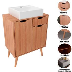 O Gabinete para Banheiro 60 cm Meire com Cuba é perfeito para quem busca um visual retrô aliado à funcionalidade. Com pés palito que adicionam charme ao ambiente e linhas retas modernas, ele é uma peça que transforma o banheiro com elegância e praticidade.