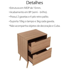 Gabinete Para Banheiro 60 cm com 2 Gavetas BN3639, ideal para inovar o seu banheiro com toque luxuoso e ao mesmo tempo refinado. Estrutura em MDP de 15mm, proporcionando maior durabilidade e resistência a peça, contando com acabamento revestido em BP (semi - brilho). Composto por 2 gavetas com corrediças metálicas e 4 pés retro palito. Suportando 10kg o tampo e 3kg cada prateleira. Perfeito para deixar seu ambiente produtivo, proporcionando uma ambientação elegante e moderna. Este móvel chegará na sua casa separado em 1 volume.