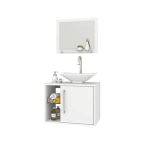 Conjunto para banheiro composto por cuba de apoio em mármore sintético, espelheira e gabinete, elaborado em MDP com espessuras de 12 mm e 15mm. Pintura da superfície em verniz poliéster brilhante, com secagem UV e impressão a laser. Acabamento nas bordas com fita de papel decorativo aplicado mecanicamente por sistema hot melting. Prateleiras de vidro de 4mm, puxador de plástico com acabamento cromado, dobradiças metálicas.